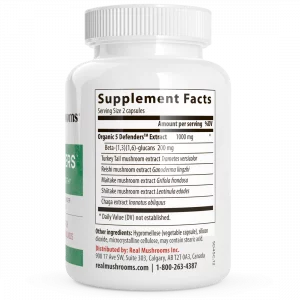 5 Defenders Organic Mushroom Capsules is a 100% organic, non-GMO blend of Reishi, Shiitake, Maitake, Turkey Tail mushrooms (fruiting bodies), and Chaga (sclerotum) packed into 500mg capsules for easy, convenient dosing and use. No filler of any kind (such as grains, mycelium, or starch) is used in creating this product, so you are getting 100% pure mushroom extract when you use it.