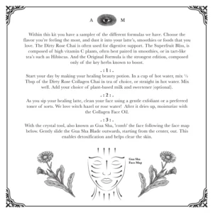 Incorporate these products into your daily routine by adding the powders to your favorite beverages and using the face oil and Gua Sha for a relaxing skincare regimen.