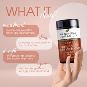 AU Natural Organics’ 100% Pure Batana Oil, sourced directly from Honduras, is a versatile and nourishing oil perfect for enhancing your hair and skin care routine. This organic oil provides deep hydration, helping to improve the appearance of both hair and skin.